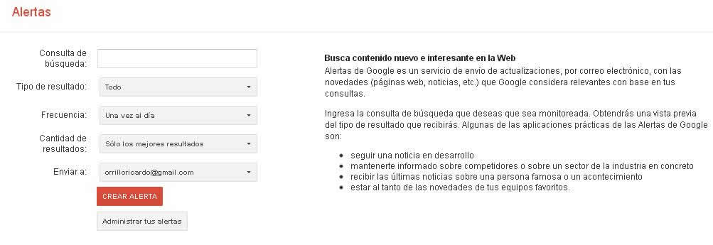 Cuando hablamos de ” las alertas de Google” estamos hablando de la aplicación gratuita de Google, que nos permitirá estar informado sobre los comentarios, noticias o menciones en general que se hagan sobre un tema, un negocio, un producto o una persona dentro de los resultados de búsqueda. Esta información se recibirá al correo electrónico definido, a través de los nuevos registros que han sido indexados recientemente en el motor de búsqueda de Google. Esto quiere decir que aparecerá el título, la descripción y la URL del sitio indexado.